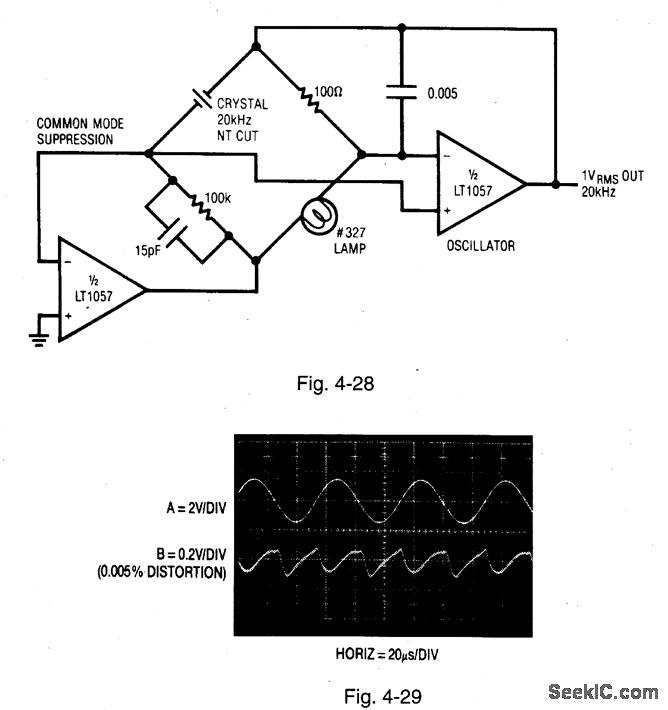 Figure 4-28 shows a bridge-oscillator circuit where the common-mode swing is suppressed by the addition of a second amplifier. This configuration forces the bridge midpoint to virtual ground by measuring the midpoint value and comparing it to ground. Because the bridge drive is complementary, the oscillator amplifier sees no common-mode swing, thus reducing distortion. Figure 4-29 shows less than 0.005% distortion(trace B)in the output(trace A)waveform.(Distortion measurements are covered In Chapter 6.) Lnvean TECHNOLOGY,APPLICATION Nom 43,P. 28.