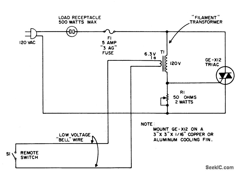 The circuit uses the primary current of a small6.3 volt filament transformer to actuate a triac and energize the load. When switch S1, in the six-volt secondary, of the transformer is open, a small magnetizing current flows through the primary winding. This magnetizing current may be large enough to trigger the triac. Therefore, a shunting resistor, R1, is required to prevent such triggering. R1, is adjusted for the highest resistance that will not cause the triac to trigger with S1 open. When single-pole remote switch, S1, closes, the secondary of the transformer is shorted and a high current flows through the 120-volt primary.This triggers the triac and energizes the load.When the triac conducts, current through the primary stops and thus prevents burning out the transformer.