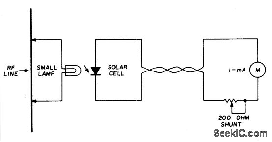 A suitable pilot lamp is illuminated by a small sample of rf and energizes an inexpensive solar cell; the dc current generated by the cell is a measure of relative rf power, and may be routed to a low-current meter located at any convenient point. A sensitive, low-current pilot lamp is desirable to cause minimum dis-turbance to normal rf circuit conditions. The number 48 or 49, 60 mA lamp is suitable for use with transmitters above 1-watt output.