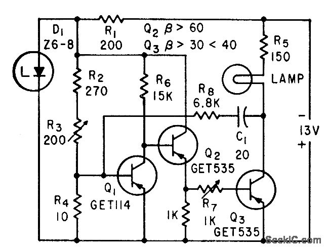 Sensing transmitter mounted on auto about 2 feel above rood, with junction of transistor connected to case is connected to low-frequency oscillator having lamp load. R7 is adjusted so lamp is out but on verge of flashing of 2℃. When temperature drops, lamp flashes. Duration of each lash increases down to 0℃ after which lamp remains on.-J. A. Irvine, Reducing Winter Skids with a Transistor Warning Circuit, Electronics, 36:4, p 56-58.