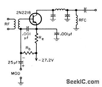 Modulation signal is injected by using two resistors, volues of which are determined by available r-f drive power; higher power is needed for larger resistance values. Excellent linearization of waveform is obtained with Re from 10 to 30 ohms. Rb should be in range from 100 to 2,000 ohms, with 470 as good com promise value. Modulation of 100% is easily achieved for CB transmitter.-B. Rheinfelder, Modulation Techniques for Transistorized A-M Transmitters, EEE, 11:7, p 54-57.