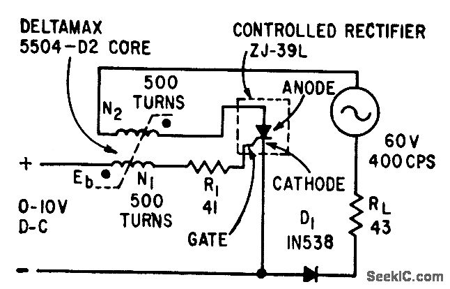 Varying d-c bias voltage applied to control winding or saturable reactor changes time for magnetic flux to reach final value, permitting use of circuit us frequency divider for timing applications. In 400-cps circuit shown, division can be adjusted over range front 1 to 10. Output diode prevents thermal runaway in controlled rectifier when anode is going negative and gate is positive to cathode.-J. S. Sicko, Counting and Timing Circuits Use Saturable Reactor, Electronics, 33:19, p 61-63.