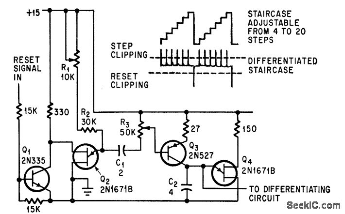 Staircase voltage builds up across C2 when pulses from Q2 turn Q3 on momentarily. R3 controls voltage amplitude of each step. R1 controls rate of free-running oscillator tube.-J. E.Russell, Ten Signals at a Glance, Electronics, 37:19, p 54-57.