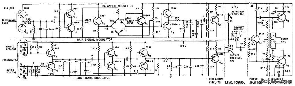 Used for modulating and mixing 1.5-kc data carrier and 600-cps ready signal in system for trans.mitting digitally encoded master shaft positions over phone line at 750 bits per sec and.-R. B. Palmiter, Digital System Positions Shafts Over Phone Line, Electronics, 32:7, p 62-66.