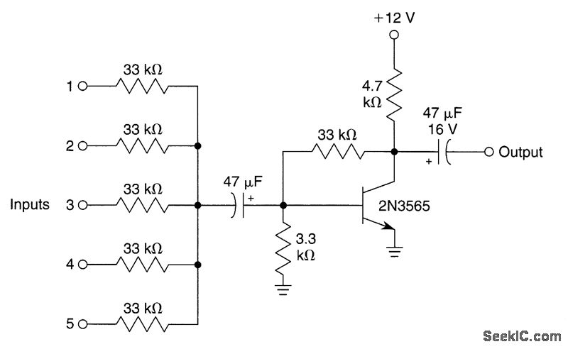 A single transistor is used as an audio mixer, the transistor serving as a feedback amplifier.