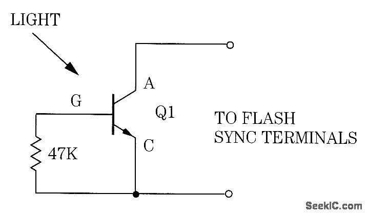 A light-activated silicon-controlled rectifier (Q1) is triggered by a flash of light from the master flash unit.