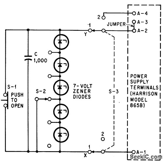 Large electrolytic capacitor and five zener diodes connected across standard transistor-regulated power supply give sweep voltage that increases 2 V per second, for classroom demonstrations.-M. H. Crothers, Added Capacitor Sweeps Power Supply, Electronics, 37:17, p 62.