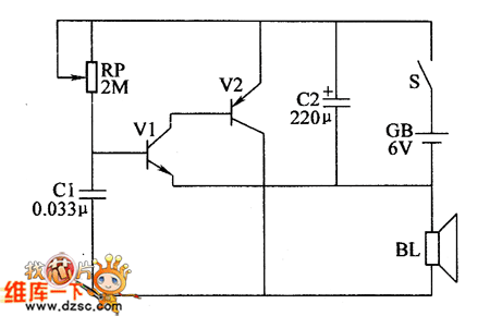 The seedling tent seedling growth stimulator circuit is composed of the transistors V1, V2, potentiometer RP, capacitors C1, C2, speaker BL, power switch S and battery CB, and the circuit is shown as the chart. V1, V2, and RP, C1 form a simple pulse generator. RP selects a small organic solid potentiometer or variable resistor. C1 chooses the monolithic capacitor or polyester capacitor; C2 selects the aluminium electrolytic capacitor with the voltage in 10V. V1 chooses 3DG6 or 59013 NPN silicon transistor; V2 uses 3AX31, 3AX81 or 3AX83 germanium PNP transistor. BL uses the 0.25W, 8Ω electric speaker. GB selects the 6V small-capacity maintenance-free battery. S uses the monopole tumble switch.