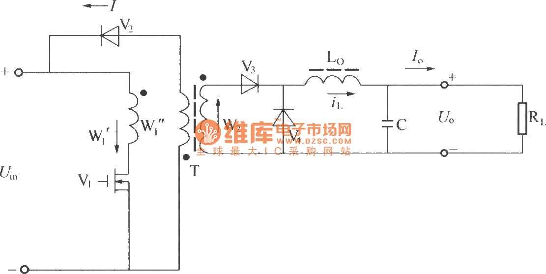 As shown in the diagram, when switch tube V1 is turn-on, input voltage Uin totally adds to justified of converter primary coil W1', induction voltage generates in degaussing iron ring W1'' make diode V2 cut-off, and induction voltage in secondary coil W2 make V3 turn-on, and sent the power of input current to inductance L0 and capacitance C and load; meanwhile it build up magnetizing current in converter, when V1 cut-off, V3 cut-ff, voltage direction on L0 is rollback andpass diode V4 to power supply to load continued, the magnetizing current in transformer willpass W1'', V 2 to release to input power source Uin and demagnetization; W1 has the function of clamp, the voltage on it is equivalent to input voltage Uin, before V1 turn- on again, demagnetizing current on T must release to zero, namely magnetic flux in T must reset, otherwise, transformer T will saturation and lead to the damage of V1. Normally, W1'=W1'', duty ratio of using two wires parallel winding coupled modes is <0.5, otherwise T will saturation. The wave form of single end normal shock converter is shown in the following diagram.