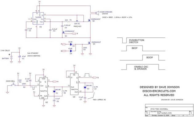 In the Star Trek ?Next Generation? TV series, the doorbell outside the private quarters of a crew member makes a particular ?beep-boop? sound. The 3v battery powered circuit below tries to simulate this sound. The circuit uses one 74HCT74 dual D flip/flop IC, wired as two one-shot circuits. Both are designed to produce a pulse about one half second long. The first pulse turns on a 555 timer to form the beep sound.