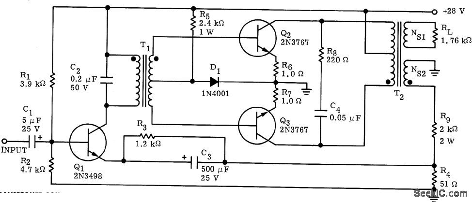 Three transistors provide stable voltage gain of 40 db and power gain of 37 db. Maximum output is 115 V rms into 1,760-ohm load, for 7.5 W.-N. Freyling, High Performance All Solid. State Servo Amplifiers, Motorola Application Note AN-225, Jan.1966.