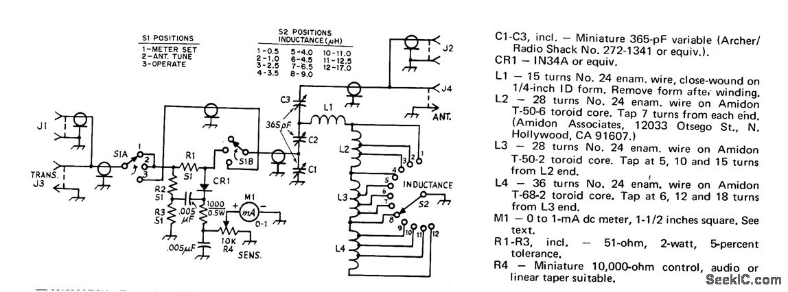 Tapped variable inductance and titree broadcast tuning capacitors are easily preadjusted to match low-power (QRP) transmitter to antenna for SWR of 1 in commonly used amateur bands. Resistance bridge is used only for initial determination of correct settings for C1, C2, C3, and S2 at each band to be used.Set S1 at n, feed peak output of transmitter to J1 (5 W maximum), and adjust R4 for full.scale frequency to be used. Repeat procedure with reading of M1. Next, conned 50.ohm resistive antenna or feed line in place of dummy load, load between CR1-R1 junction and ground. Meter reading should now drop to zero, indicating null at 50 ohms,Move 50-ohm dummy load to J2, set S1 at 2, and adjust seetings of C1,C2, and C3 for zero deflection of meter,Note settings, then repeat for each other transmitter frequency to be used. Repeat procedure with antenna or feed line in place of dummy load, After completing adjustments, set S1 to 3 to bypass bridge for normal transmitter opetation.-D. DeMaw, A Poor Ham's QRP Transmatch, QST, Oct. 1973, p 11,13.