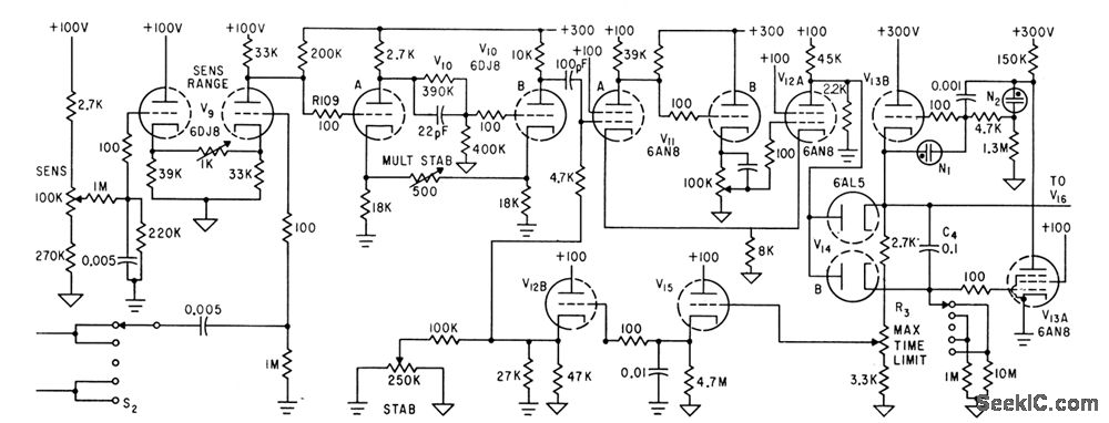 Trigger pulse, selected by S2, is compared to fixed bias on one half of comparator tube V9. Trigger shaping by V10 provides strong, sharp pulse for gating mvbr V11-V12A, which turns off diodes V14, allowing Miller integrator V13A and cathode follower V13B to start lime base runup that drivesC4 to 150V. Circuit then reverts to normal.-O. Rich, Jr. and R. V. Hill, R-F Spot Welder Reattaches Retina of Human Eye, Electronics,34:32, p 160-163.