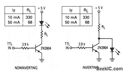 These circuits show an infrared LED (MFOE3200, 3201, 3202) that is used as fiberoptic drivers for both noninverting and inverting TTL inputs.