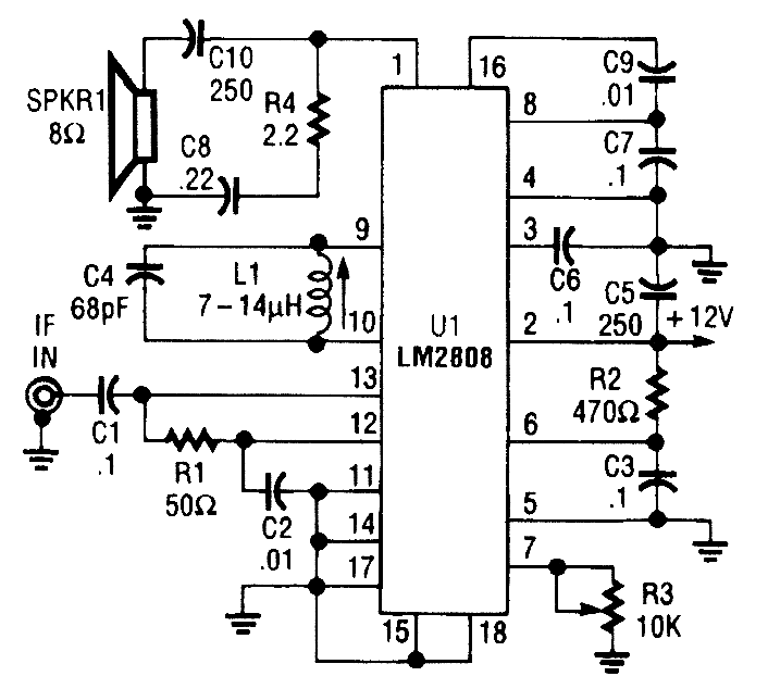 An LM2808 performs IF amplification of the 4.5-MHz sound subcarrier, limiting, detection, and audio amplification. If the center frequency must be changed, then change L1/C4. Audio out-put is 0.5 W. R3 is the volume control.