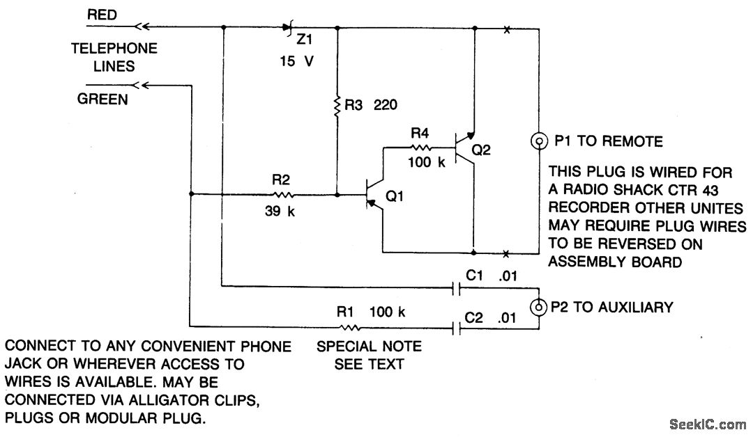 The device is a dc switch that is normally on via the forward biasing of Q1 via R3.Q1 now clamps Q2 into a forward state by biasing its complement well into a saturated state via R4. The dc switch is turned off via a negative voltage above that of the zener (D1). This voltage is usually about 48 and is the on-hook value of the phone line. This negative voltage overrides the effect of R3 and keeps the circuit off. When the phone is off the hook, the 48 vblts drops to 10 volts, that is below the zener voltage of D1 and R3 now tums the circuit on. The audio signal is via attenuator resistor R1 and dc isolating capacitors C1, C2. The device is a high impedance switch that isolates the recording controlled device from the phone line via some relatively simple electronic circuitry. It requires no battery and obtains power for operating via the remote jack that in most recorders is a source of 6 volts. When clamped to ground it initiates recorder operation. The unit interfaces with most portable cassette recorders providing they contain a remote control jack.