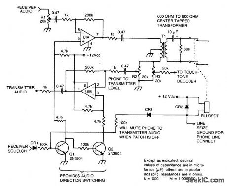 This circuit provides for the receiver-to-phone line and phone line-to-transmitter link, with both using an op amp for gain.