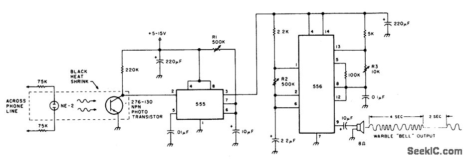 The speaker emits a distinctive warble tone when ring pulses are applied to the phone line. Use this circuit as a remote bell or discon-nect the phone's ringer for direct use. R1 ad-justs the duration of the output; R2 and R3 control the tone's duty cycle and frequency. The transistor is a general-purpose NPN photodevice. The neon bulb and transistor are coupled with the heat-shrink tubing to form an optoisolator.