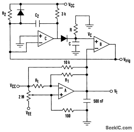 Thermistors have found their way into a number of temperature-sensing applications. However, their resistance is a nonlinear function of temperature. In many applications, a digital readout of the thermistor also is desired. It is possible to produce a digital signal with a frequency that is linearly proportional to the temperature. The entire active portion of the circuitry can be implemented using 3/4 of an LM339. Comparator A is configured to operate as an op amp that generates voltage (Vt) which is inversely proportional to the thermistor's resistance, Rt. The voltage Vt is used as the thresh-old for the relation oscillator formed by comparators B and C. Comparator B monitors the voltage on the integrating capacitor (Vc). When it crosses Vt, it triggers the one-shot formed by comparator C via the signal Vtrig The output of comparator C resets the integrating capacitor for a duration, to, where to= (R2+3 kΩ)C2. Then the cycle begins again. The circuit achieves linear readout because the exponential nonlinearity of the thermistor is compensated by the exponential decay of the voltage in the relaxation oscillator.