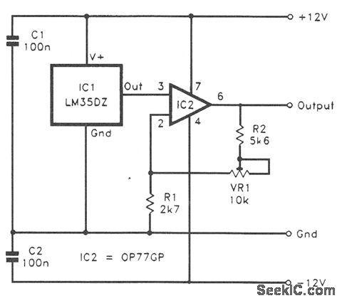 This simple temperature interface covers a range of 0 to 51°C. Dual balanced 12-V supplies were used to power the prototype, but dual 5-V supplies should just about suffice. IC1 is the temperature sensor. Over this range of temperatures, the LM35CZ should work well. The output from IC1 feeds into a noninverting-mode amplifier based on IC2. The closed-loop voltage gain of the amplifier is set by resistors R1 and R2 and preset VR1. The latter is adjusted to give a voltage gain of 5. VR1 is given the correct setting by first subjecting the sensor to a temperature, which is equal to about 50 or 100 percent of the full-scale value (i.e., about 20 to 51°C.). In most cases, the room temperature will be about 20 to 25°C, which will suffice. An accurate thermometer is used to measure the room temperature, and then VR1 is adjusted for the appropriate reading.