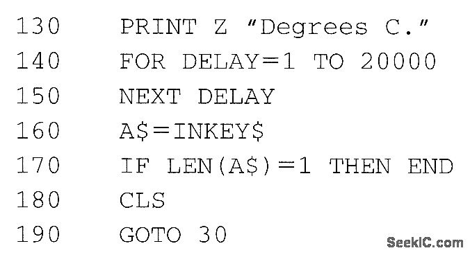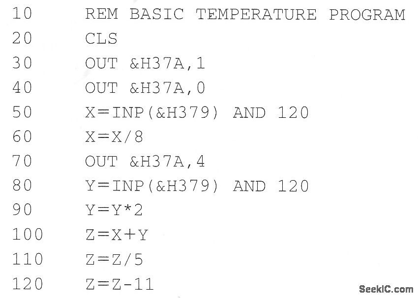 The following GW Basic or Q BASIC program reads the temperature sensor and prints the temperature on the screen: