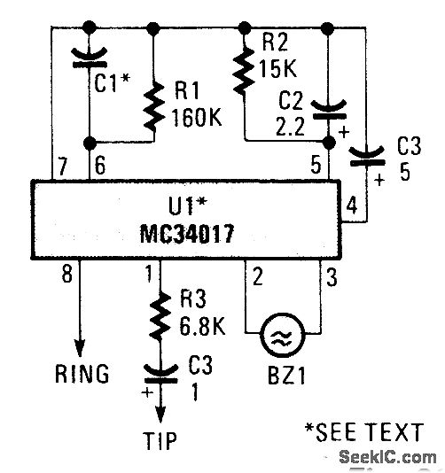 A telephone bell circuit usmg a Motorola MC34017 can be built from a few components. C1 and UI depend on the type of nng required.U1 C1 RingMC34017-1 1 000 pF 1 kHzMC34017-2 500 pF 2 kHZMC34017-3 2 000 pF 500 HzSelect the verslon of MC34017 and C1 from this table.