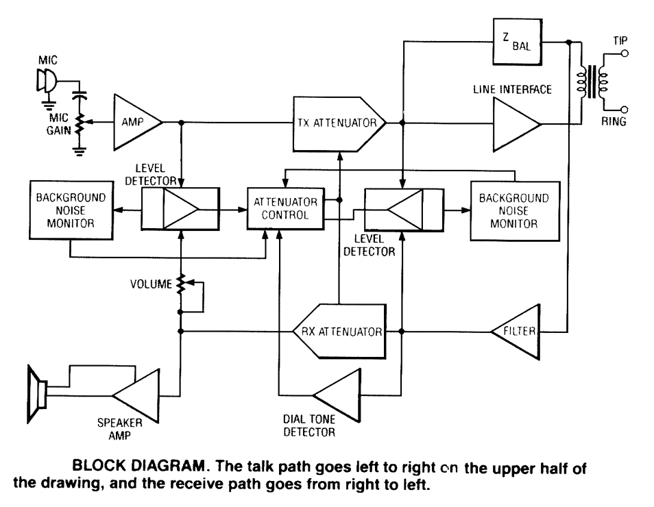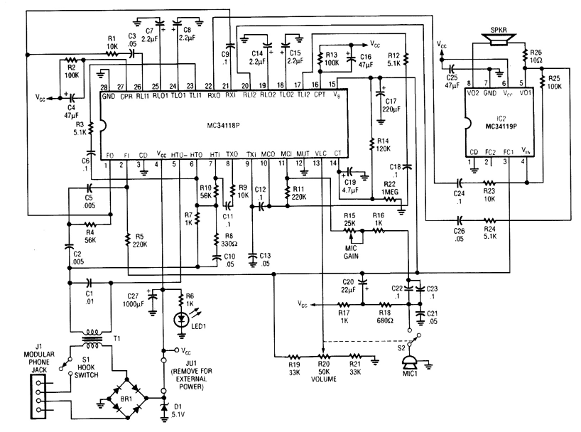Using a Motorola MC34118 speakerphone IC, this adapter can be used with a regular telephone to provide speaker capability. This device is powered from the phone Iine, but it can be powered via an extemal power supply if the line loop current is marginally low. An external phone is needed for ringing and dialing functions.