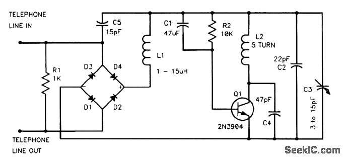 Q1 is an oscillator tuned to a quiet spot in the FM broadcast band. Dc from the line powers the bug. Diodes D1 through D4 ensure proper polarity. R1 maintains a suitable voltage drop for the bug. Audio on the line causes incidental FM, which can be heard on an FM receiver tuned to the frequency of the oscillator.Warning: Use of this device for certain purposes could violate federal and/or state laws and subject the violator to prosecution.