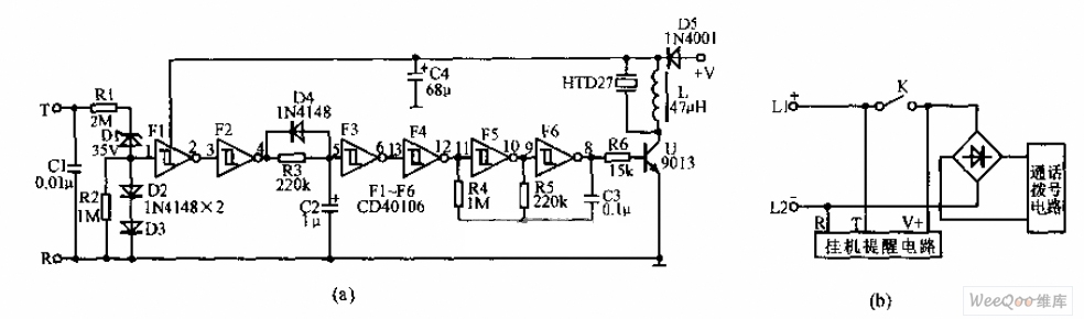 Telephone on-hook warning circuit diagram is shown in the above picture. The IC uses CMOS Shmidt hex inverter CD40106. C1 is better to use ceramic capacitance which can withstand voltage of over 100V, and L is better to choose small color-code inductor. There are no special requirements for the rest component. When the telephone is on-hook, there are several tens of volt-ampere in ends T and R. A short period of sound indicating on-hook is given out via HTD. It is shown in the picture (a). Because the sound only uses the memory function of C4, C4 can only be re-charged when the telephone is off-hook next time after the sound is given out. And the warning sound can be given out when the telephone is on-hook next time. The assembling diagram is shown in the picture (b).