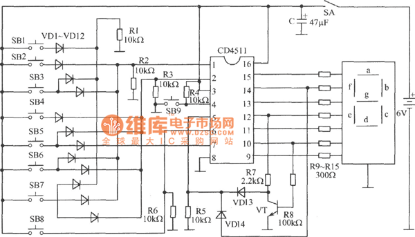 In the figure, the digital display answering racer adapts the digital pipe as the display, which can make players and audiences see the results, so the transparence is good.Working principles: digital display answering racer circuit is shown in the figure. CD4511 is main part of the digital display answering racer. This is a BCD-7 lock/decoder/drive circuit, whose 1, 2, 6 and 7 pins are the input terminal, and 9~15 pins are the display output terminals. 3-pin LT is the detection terminal, when it is 0 , the output is 1 .