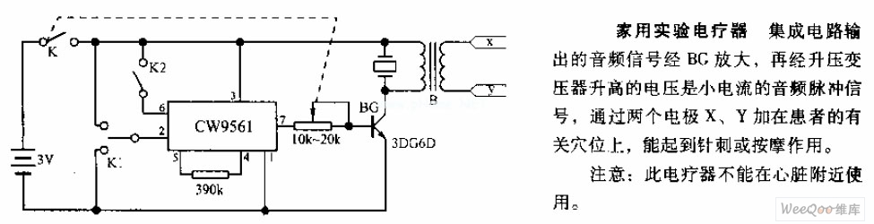 The domestic experiment electro medical apparatus circuit The audio signal output by the integrated circuit is amplified by BG, and the voltage boosted by the transformer is the audio pulse signal of the small current, by putting the two electrodes of X and Y on the acupuncture points of the patients, the machine can fulfill the function of puncturing or massage.Notes: the electro medical apparatus can't be used near the heart.