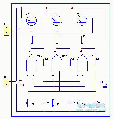 Published:2011/9/12 21:29:00 Author:Ecco | Keyword: Three-button interlock, electronic switch | From:SeekIC