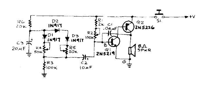 When the door is pushed, you hear a whisper that slide up to a higher frequency. The oscillator frequency is determined by AF coupling capacitance, C 1 and the value of the resistor connected between the base of IQ and the earth. This resistance, RBG is equal to (Ri + R2) RJ. First, suppose that 51 is closed and R2 have been adjusted to produce a pleasant, low frequency tone. The capacitor C3 charges through R6 until it reaches such a tension that will cause diode Dl to conduct.