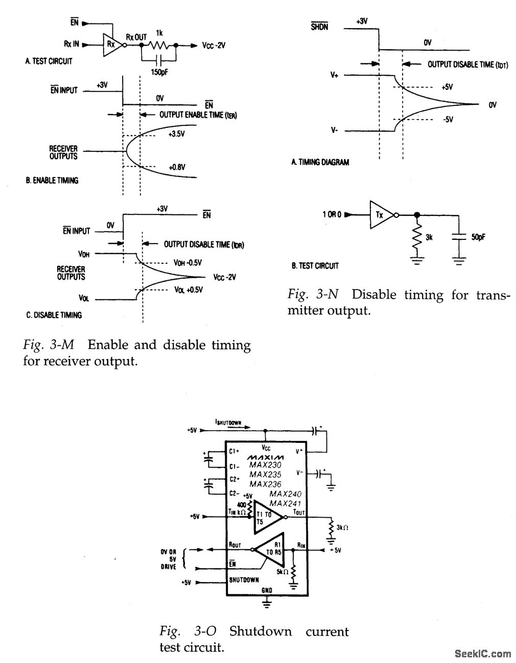 Figure 3-P shows a transition slew-rate test circuit for the MAX200/11/13. (Slew rate is covered in Chapter 6.) For reference, the slew rate is 5.5V/μs (typical) and 30V/μs (maximum) for the ICs involved.