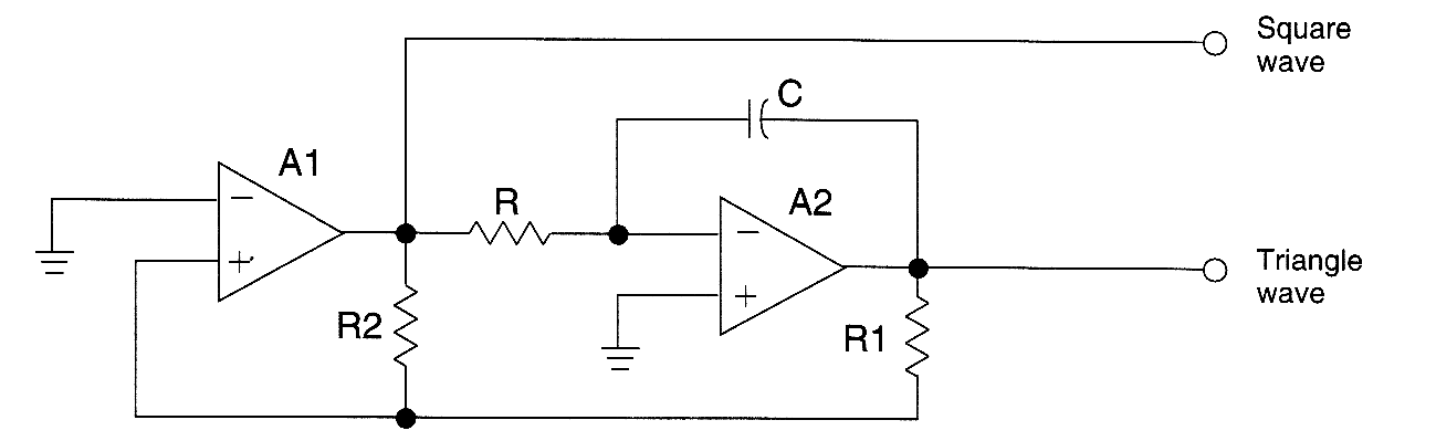 The circuit will generate precision triangle and square waves. The output amplitude of the square wave is set by the output swing of op amp A1, and R1/R2 sets the triangle amplitude. The frequency of oscillation in either case is approximately 1/0.69RC.The square wave will maintain 50% duty cycle-even if the amplitude of the oscillation is not symmetrical. The use of a fast op amp in this circuit will allow good square waves to be generated to quite high frequencies. Because the amplifier runs open-loop, corapensation is not necessary. The triangle-generating amplifier should be a compensated type. A dual op amp, such as the MC1458, can be used for most applications.