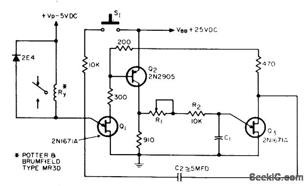 Inexpensive relay provides excellent timing accuracy and high isolation in circuit using power gain of emitter junction of ujt Q1. Timing is determined by R1, R2, and C1.-N. H. Kadivnik, Interval Timer, EEE, 12:5, p 75.