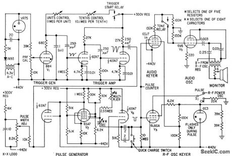 Generates keying pulses up to 2 sec wide at prf down to 0.1 pps. Oscillator cutoff bias is gated off during pulse operation and switched off during c-w operation. Pulse repetition generator V1 is relaxation oscillator with trigger period variable in 0.1-sec steps from 0.1 to 10.9 sec. Fast-recovery phantastron pulse generator 1/2 allows precise pulsing up to 90% duty cycle, with pulse lengths from 0.005 to 2 sec.-B. J. Cosman amd T. F.Hueter, Instrumentation for Ultrasonic Neurosurgery, Electronics, 32:20, p 53-57.