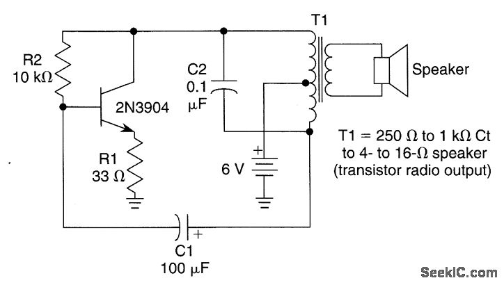 In this circuit, C2 and T1 determine the tone generated and C1/R1 control the blocking rate. The signal produced is an interrupted tone, like a police whistle or toy ray gun, depending on C1 and C2.