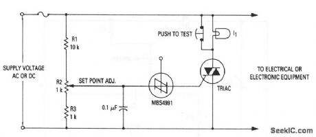 This circuit provides positive protection of expensive electrical or electronic equipment against excessive supply voltage (resulting from improper switching, short circuits, failure of regulators, etc.). The circuit is used where it is economically desirable to shut down equipment, rather than allow the equipment to operate at excessive voltages. The circuit quickly places a short across the power lines (ac or dc), and thereby drops the voltage to the protected device to near zero and blows a fuse. With the values shown, the crowbar operating point (set point) can be adjusted over the range of 60 to 120 Vdc or 42 to 84 Vac. The values of R1 to R3 can be changed to cover different supply voltages, but the triac voltage rating must be greater than the highest operating point that is set by R2. Lamp II (with a voltage rating that is equal to the supply) can be used to check the set point and operation of the circuit, by opening the push-to-test switch and adjusting the input or set point to fire the SBS. An alarm unit such as the Mallory Sonalert can be connected across the fuse to provide an audible indication of crowbar action. Notice that this circuit cannot act on short, infrequent power-line transients. (View)