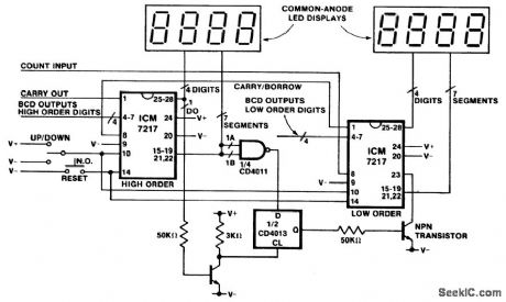8-digit up/down counter using two cascaded ICM7217 28-pin DIPs. The NAND gate whether a digit is active since one of the two segments not-a or not-b is active on any unblanked number. The flip-flop is clocked by the LSB of the higher-order counter so if this digit is unblanked the Q output of the flip-flop goes high and turns on the NPN transistor, inhibiting leading zero blanking on the lower-order counter (courtesy Intersil, Inc.). (View)