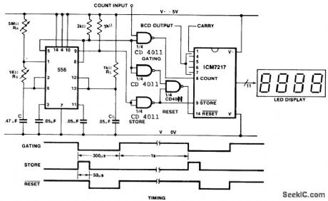 Inexpensive frequency counter/tachometer. This circuit uses a 556 dual timer to generate the gating, not-store and not-reset signals for a ICM7217 counter. One timer is an astable multivibrator using RA, RB and C to provide an output that is positive for approximately 1 second and negative for approximately 300 to 500 μs to serve as the gating signal. The system is calibrated by using a 5M pot for RA as a coarse control and a 1 K pot for RB as a fine control. The other timer is a one-shot multivibrator triggered by the negative-going edge of the gating. This output at pin 9 is inverted to serve as the store pulse and to hold not-reset high. When the one-shot times out and the store goes high, not-reset goes low, resetting the counter. The one-shot pulse width is approximately 50 μs with the components shown. When fine trimming with FIB care should be taken to keep the gating low time at least twice as long as the one-shot pulse width (courtesy Intersil, Inc.). (View)