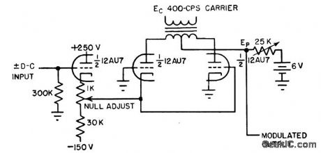 Increasing magnitude of carrier voltage in-creases modulated output. Used in amplification of d-c signals for automatic control systems.-L. S. Klivans, Modulators for Automatic Control Systems, Electronics, 31:1, p 82-84. (View)