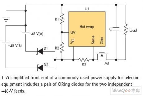 Figure 1 is the simplified front end of the common power supply part of the telecommunication equipment. The OR operation of the two inputs is made by D1 and D2. Once the voltage through OR operation is higher than low-voltage threshold determined by R1 and R2, hot plug circuit (U1) add the electricity gradually for the load (data processing).