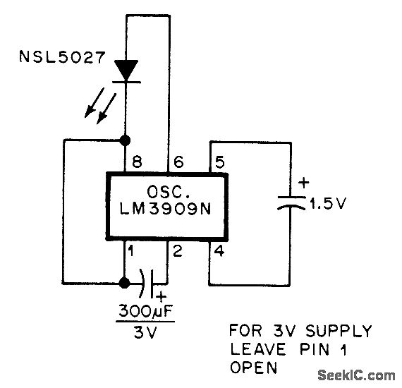 Digi-Key LM3909N flasher/oscillator drives LED serving as ON/OFF indicator for battery-operated devices. At flash rate of 2 Hz, battery life almost equals shelf life.-C, Shaw, ON-OFF Indicator for Battery Device, QST, March 1978, p 41-42.