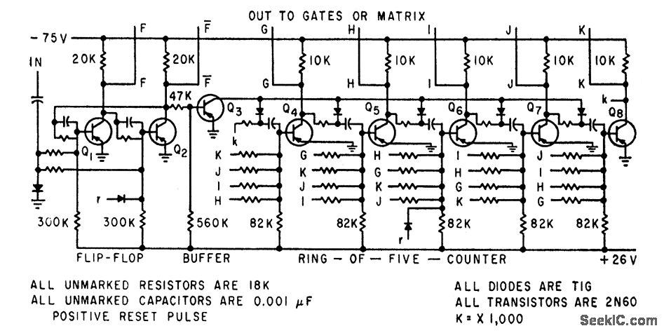 Flip-fiop drives ring-of-five stage that in tum drives diode malrix which trcnslales each slored deci-mal number to electroluminescent display segment code.-R. C. Lyman and C. I. Jones, Eleclroluminescenf Panels for Aulomatic Displays, Electronics, 32:28, p 44-47.