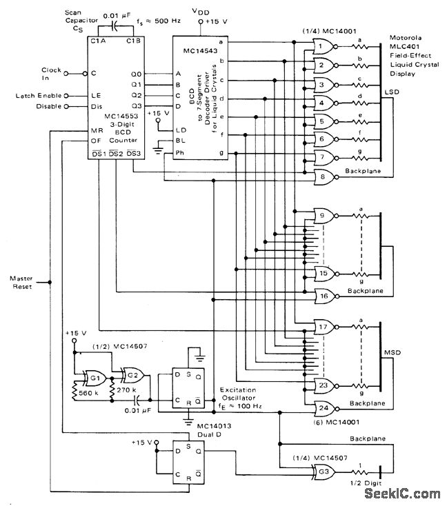 Uses MLC401 field-effect liquid crystal display, which is more suitable for multiplexing than dynamic-scattering LCD. Counters, latches, multiplexet, and scan circuits are all inMC14553 3-digit BCD counter whose outputs feed MC14543 decoder and driver for display. Excitation frequency of 100 Hz is derived from square-wave oscillator G1-G2 having exactly 50% duty cycle. Scan frequency is about 500 Hz, giving display refresh rate of 170 Hz, which is well beyond detectable flicker rate.-A. Pshaenich, Interface Considerations for Numeric Display Systems, Motorola, Phoenix, AZ, 1975, AN-741, p 6.