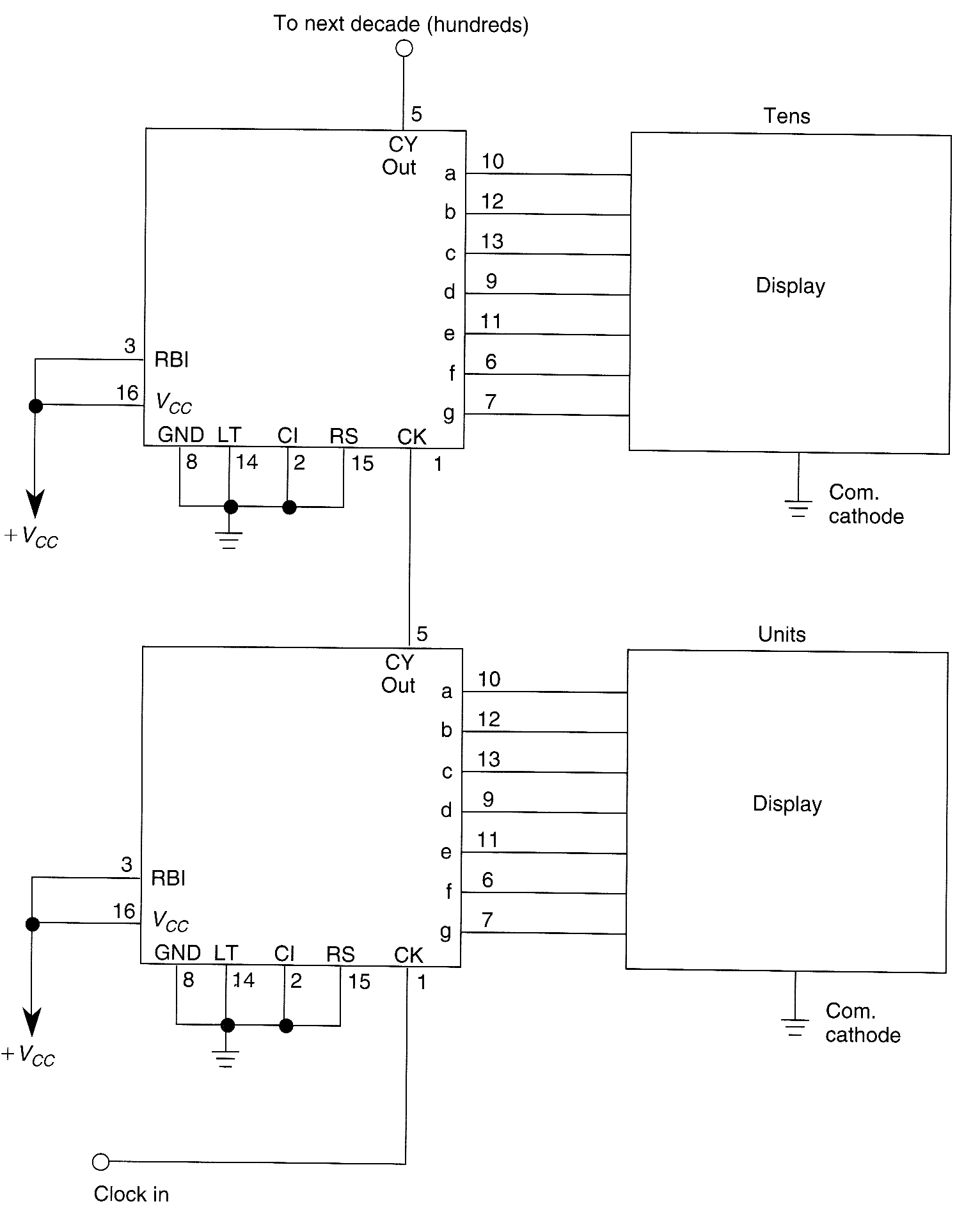 TO drive two or more common-cathode displays two or more 4033 decode counters can be cascaded