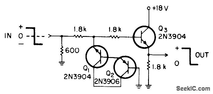 Polar clamp was developed to provide overvoltage input protection for ±6 VDC teleprinter signals at 10mA. Circuit will withstand input transients up to 120 VDC at 20mA. When input exceeds emitter-base break-down voltage of Q1, Q2 becomes forward-biased for clamping of input. With excessive negative input, Q1 is forward-biased and emitter-base path in Q2 completes clamping action.-R. R. Breazzano, A Polar Clamp, EDN|EEE Magazine, June 15, 1971, p 59.