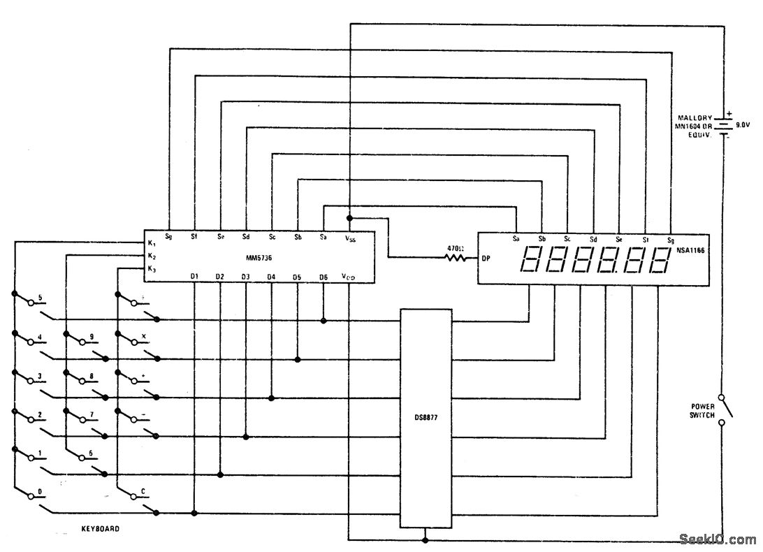 National DS8877 drive is shown in configuration for use with 6-digit calculator Digit current is in range of 5-50 mA,Driver requires no standby power and operates from either 4.5 V, 6 V, or 9 V.- Interface Databook National Semiconductor,Santa Clara,CA,1978, p 5-52-5-53.