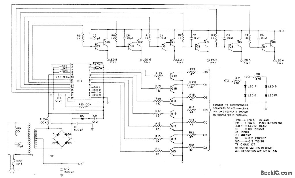 National MM5313 PM05 digital clock IC drives display which includes four discrete LEDs mounted on readout panel to form colons between hours, minutes, and seconds. AC supply provides 14 VDC for IC and 7 VDC for displays. Hold push-button SWt stops count to give precise seconds setting. Slow-slew button SW2 advances time at 1 min/s for precise setting, and fast-slew but-ton SW3 advances time 1 h/s. Digit drivers Q1-Q12 are Darlington-connected pairs of PNPtran-sistors. Segment drivers Q13-Q19 are single PNP transistors.-M. S. Robbins, Electronic Clocks and Watches, Howard W. Sams, Indi-anapolis, IN, 1975, p 103 and 113.
